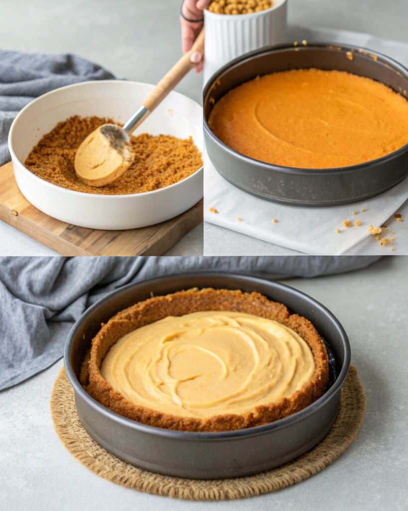 Next, drizzle in the 1/2 cup of melted butter and mix until everything is evenly coated and resembles wet sand. This is crucial, as it ensures the crust holds together once pressed into the pan. Take this mixture and press it firmly into the bottom of a 9-inch springform pan. Aim for an even layer that’s slightly thicker at the edges. This will provide a sturdy base for your cheesecake. Once you’ve pressed down, let it chill in the refrigerator while you prepare the pumpkin filling for optimal firmness.