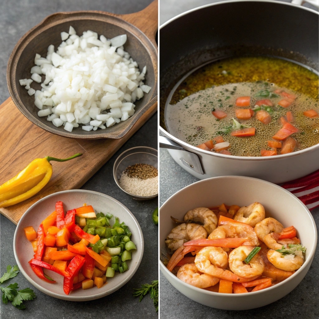 Let’s kick this step off with a quick discussion about the importance of each ingredient. First up is the shrimp—this is the star of the dish, so aim for fresh or high-quality frozen shrimp to guarantee the best flavor. The olive oil gives a nice base to sauté all your lovely aromatics, bringing everything together. The onion and garlic work wonders in enhancing flavors, providing a savory foundation. The bell pepper and carrot add color and crunch, making every spoonful visually appealing and hearty.